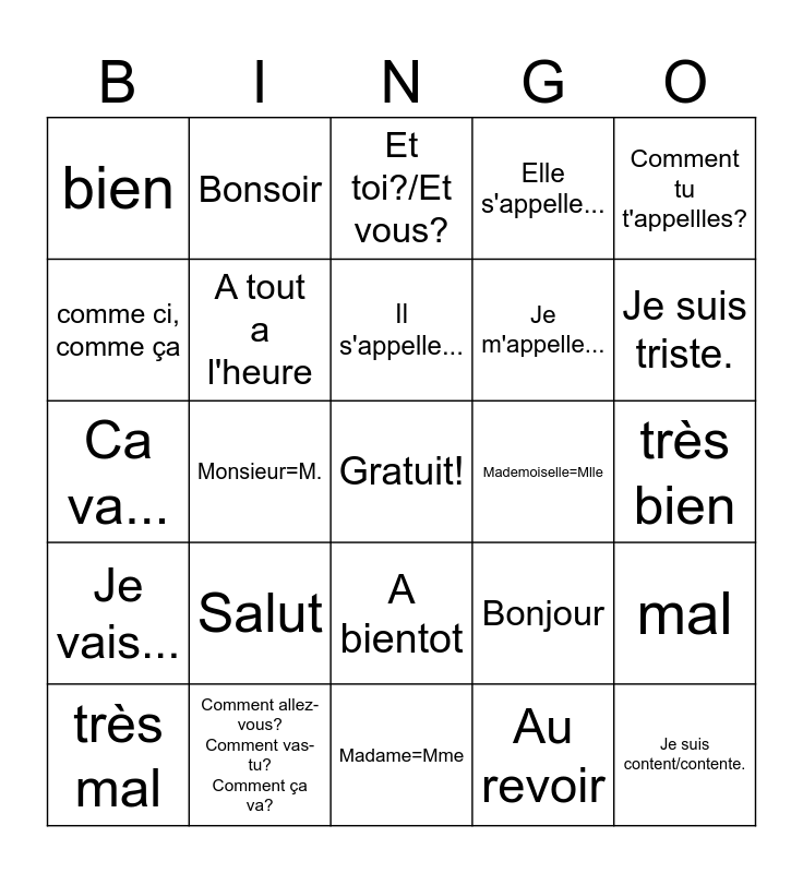 This bingo card has a free space and 24 words: Salut, Comment allez-vous? Comment vas-tu? Comment ça va?, Il s'appelle..., très mal, Comment tu t'appellles?, bien, comme ci, comme ça, Bonsoir, Mademoiselle=Mlle, A bientot, Je m'appelle..., Ca va..., Bonjour, mal, A tout a l'heure, Au revoir, très bien, Et toi?/Et vous?, Je suis triste., Monsieur=M., Je suis content/contente., Je vais..., Elle s'appelle... and Madame=Mme.