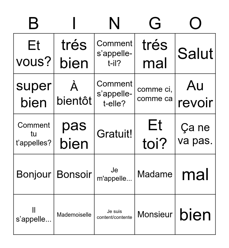 This bingo card has a free space and 24 words: Bonsoir, Mademoiselle, Comment s’appelle-t-elle?, Il s’appelle..., Salut, Et vous?, super bien, trés bien, Et toi?, Je m'appelle..., comme ci, comme ca, Comment tu t’appelles?, Madame, mal, À bientôt, Monsieur, Ça ne va pas., Comment s’appelle-t-il?, Au revoir, pas bien, bien, Bonjour, trés mal and Je suis content/contente.