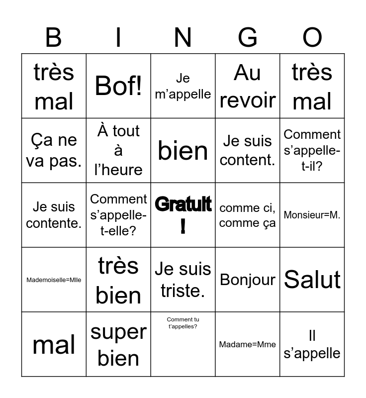 This bingo card has a free space and 24 words: très bien, super bien, bien, mal, très mal, très mal, Ça ne va pas., Bof!, comme ci, comme ça, Je suis triste., Je suis content., Je suis contente., Bonjour, Salut, À tout à l’heure, Madame=Mme, Monsieur=M., Je m’appelle, Comment s’appelle-t-il?, Comment s’appelle-t-elle?, Il s’appelle, Mademoiselle=Mlle, Au revoir and Comment tu t’appelles?.