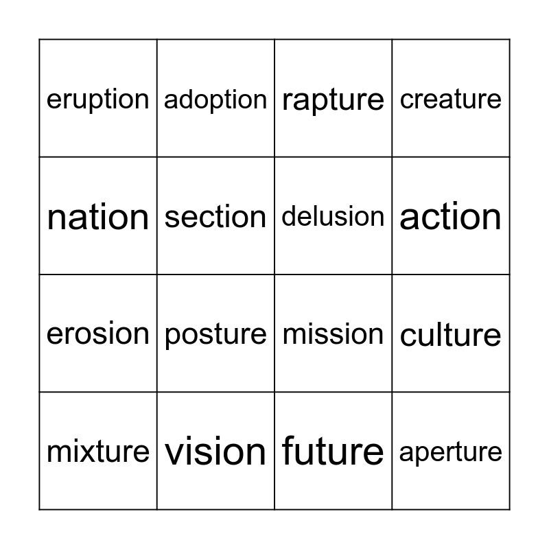 This bingo card has 25 words: Free!, motion, action, education, nation, eruption, section, adoption, vision, lesion, erosion, mission, version, pension, delusion, explosion, future, rapture, posture, culture, mixture, feature, aperture, creature and immature.