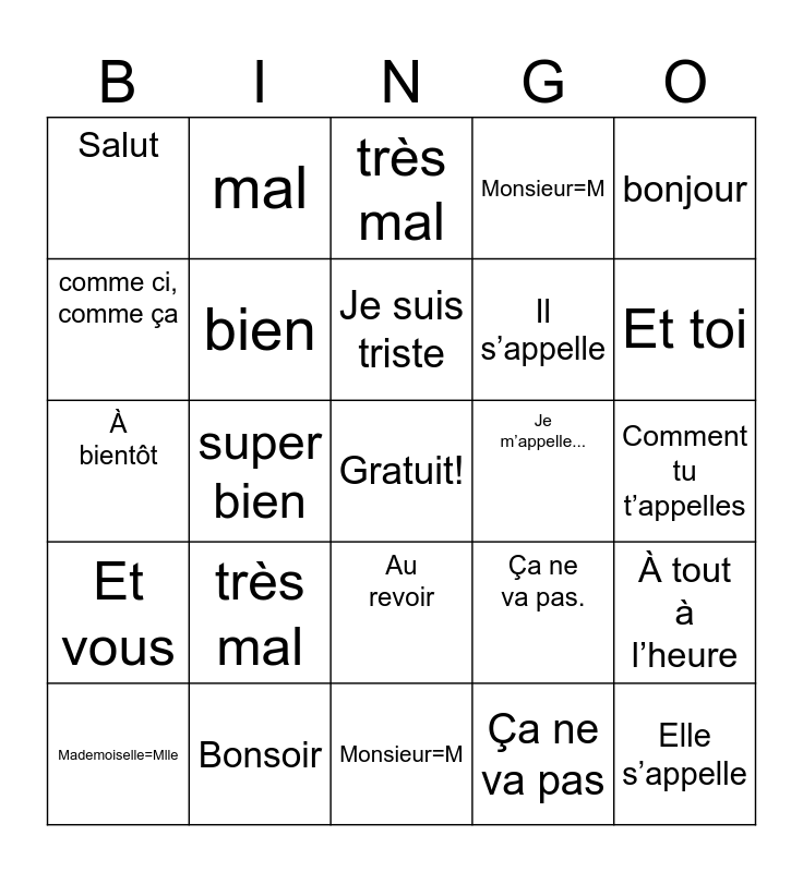 This bingo card has a free space and 24 words: très mal, Bonsoir, Je suis triste, Mademoiselle=Mlle, bonjour, Salut, comme ci, comme ça, mal, Je m’appelle..., Au revoir, Il s’appelle, À bientôt, Ça ne va pas., À tout à l’heure, bien, Ça ne va pas, Comment tu t’appelles, très mal, Et toi, super bien, Elle s’appelle, Et vous, Monsieur=M and Monsieur=M.