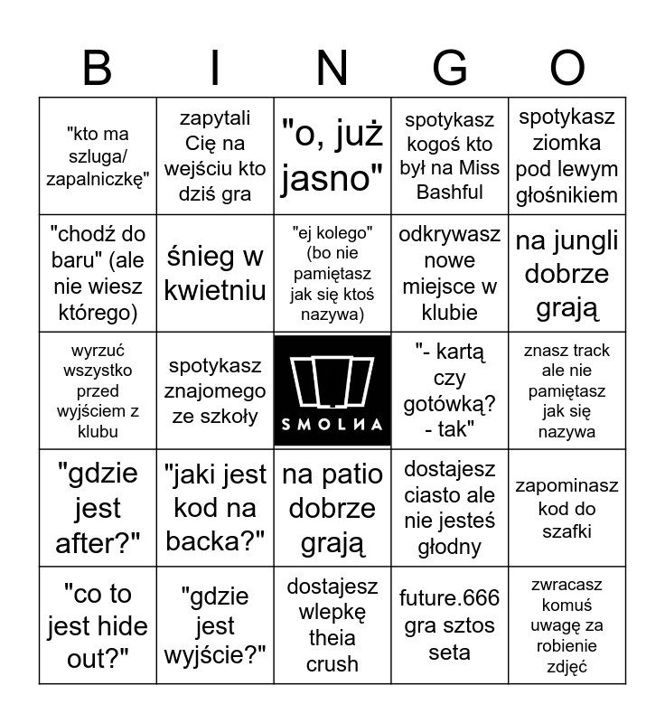 This bingo card has a free space and 24 words: "jaki jest kod na backa?", "gdzie jest wyjście?", "ej kolego" (bo nie pamiętasz jak się ktoś nazywa), "co to jest hide out?", spotykasz ziomka pod lewym głośnikiem, "kto ma szluga/ zapalniczkę", "chodź do baru" (ale nie wiesz którego), zapytali Cię na wejściu kto dziś gra, "- kartą czy gotówką? - tak", na patio dobrze grają, odkrywasz nowe miejsce w klubie, wyrzuć wszystko przed wyjściem z klubu, dostajesz ciasto ale nie jesteś głodny, zapominasz kod do szafki, śnieg w kwietniu, future.666 gra sztos seta, znasz track ale nie pamiętasz jak się nazywa, "o, już jasno", na jungli dobrze grają, spotykasz znajomego ze szkoły, zwracasz komuś uwagę za robienie zdjęć, "gdzie jest after?", spotykasz kogoś kto był na Miss Bashful and dostajesz wlepkę theia crush.