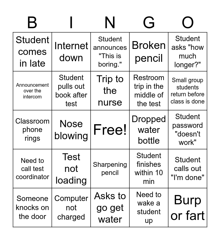This bingo card has a free space and 24 words: Test not loading, Computer not charged, Trip to the nurse, Someone knocks on the door, Student asks "how much longer?", Student comes in late, Announcement over the intercom, Internet down, Dropped water bottle, Sharpening pencil, Restroom trip in the middle of the test, Classroom phone rings, Student finishes within 10 min, Student calls out "I'm done", Student pulls out book after test, Need to wake a student up, Student password "doesn't work", Student announces "This is boring.", Small group students return before class is done, Nose blowing, Burp or fart, Need to call test coordinator, Broken pencil and Asks to go get water.