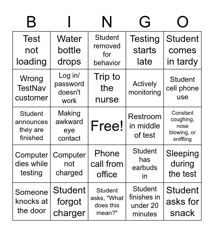 This bingo card has a free space and 24 words: Computer not charged, Student forgot charger, Trip to the nurse, Someone knocks at the door, Student comes in tardy, Test not loading, Wrong TestNav customer, Water bottle drops, Restroom in middle of test, Phone call from office, Actively monitoring, Student announces they are finished, Student has earbuds in, Sleeping during the test, Log in/ password doesn't work, Student finishes in under 20 minutes, Constant coughing, nose blowing, or sniffling, Student removed for behavior, Student cell phone use, Making awkward eye contact, Student asks for snack, Computer dies while testing, Testing starts late and Student asks, "What does this mean?".