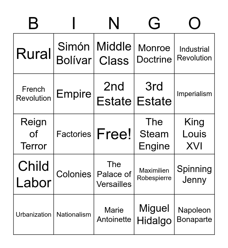 This bingo card has a free space and 24 words: Colonies, Nationalism, 2nd Estate, Urbanization, Industrial Revolution, Rural, French Revolution, Simón Bolívar, The Steam Engine, The Palace of Versailles, 3rd Estate, Reign of Terror, Maximilien Robespierre, Spinning Jenny, Empire, Miguel Hidalgo, King Louis XVI, Middle Class, Imperialism, Factories, Napoleon Bonaparte, Child Labor, Monroe Doctrine and Marie Antoinette.