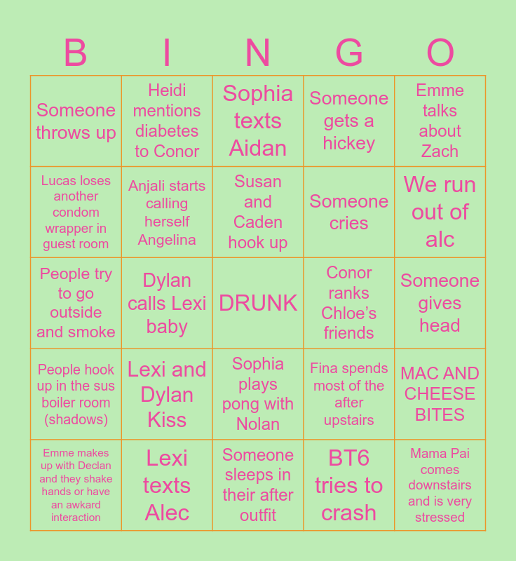 This bingo card has a free space and 24 words: Lexi and Dylan Kiss, Lexi texts Alec, Susan and Caden hook up, Emme makes up with Declan and they shake hands or have an awkard interaction, Emme talks about Zach, Someone throws up, Lucas loses another condom wrapper in guest room, Heidi mentions diabetes to Conor, Conor ranks Chloe’s friends, Sophia plays pong with Nolan, Someone cries, People try to go outside and smoke, Fina spends most of the after upstairs, MAC AND CHEESE BITES, Anjali starts calling herself Angelina, BT6 tries to crash, Someone gives head, Sophia texts Aidan, We run out of alc, Dylan calls Lexi baby, Mama Pai comes downstairs and is very stressed, People hook up in the sus boiler room (shadows), Someone gets a hickey and Someone sleeps in their after outfit.
