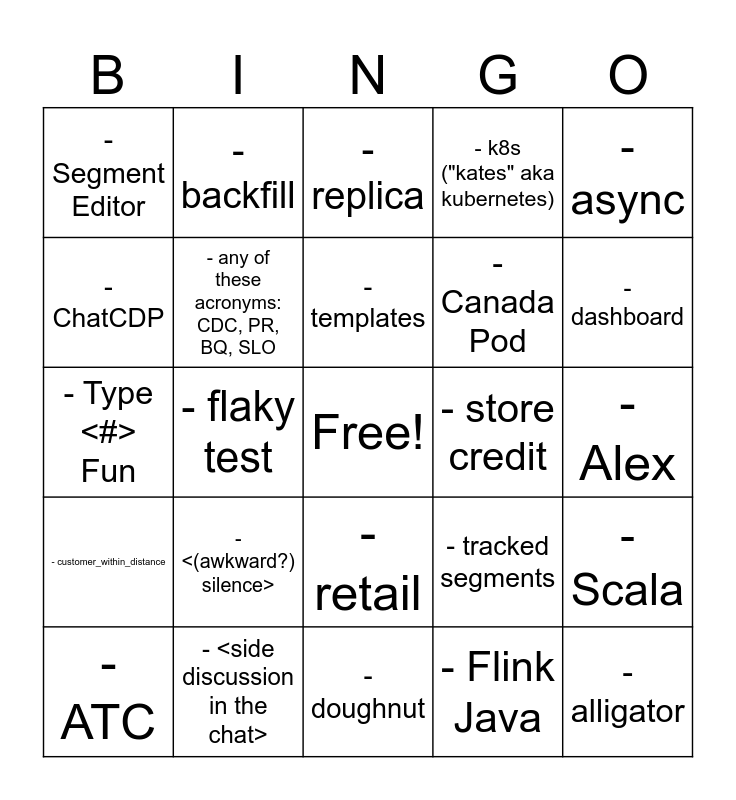 This bingo card has a free space and 49 words: - cursor, - alligator, - trolling, - doughnut, - <(awkward?) silence>, - reconciliation, - backfill, - This Week In CDP, - ChatCDP, - Syntax Migration, - any of these acronyms: CDC, PR, BQ, SLO, - k8s ("kates" aka kubernetes), - Scala, - tracked segments, - On-Call, - dependabot, - templates, - store credit, - metafield, - async, - flaky test, - Flink Java, - Segment Editor, - Canada Pod, - streaming platform, - dashboard, - ATC, - context fluff, - retail, - customer_within_distance, - anniversary, - unicorn, - incident, - monorail, - <side discussion in the chat>, - someone mentioning they're off tomorrow, - products purchased, - BFCM, - Alex, - CDPeeps, - gameday, - load balancer, - Patrick, - 3rd, - Type <#> Fun, - replica, - v2, - load test and - burst.