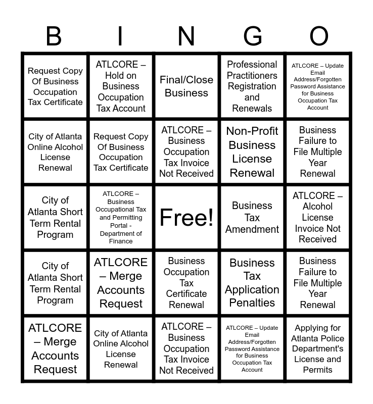 This bingo card has a free space and 37 words: Final/Close Business, Business Occupation Tax Certificate Renewal, Business Tax Amendment, Request Copy Of Business Occupation Tax Certificate, Business Failure to File Multiple Year Renewal, ATLCORE – Merge Accounts Request, ATLCORE – Business Occupation Tax Invoice Not Received, ATLCORE – Change, Remove, or Add a Contact for a Business Occupation Tax Account, ATLCORE – Update Email Address/Forgotten Password Assistance for Business Occupation Tax Account, ATLCORE – Hold on Business Occupation Tax Account, ATLCORE – Business Occupational Tax and Permitting Portal - Department of Finance, Professional Practitioners Registration and Renewals, Applying for Atlanta Police Department's License and Permits, ATLCORE – Alcohol License Invoice Not Received, City of Atlanta Online Alcohol License Renewal, City of Atlanta Short Term Rental Program, Payment for Excise Tax, Final/Close Business, Business Occupation Tax Certificate Renewal, Business Tax Amendment, Request Copy Of Business Occupation Tax Certificate, Business Failure to File Multiple Year Renewal, ATLCORE – Merge Accounts Request, ATLCORE – Business Occupation Tax Invoice Not Received, ATLCORE – Change, Remove, or Add a Contact for a Business Occupation Tax Account, ATLCORE – Update Email Address/Forgotten Password Assistance for Business Occupation Tax Account, ATLCORE – Hold on Business Occupation Tax Account, ATLCORE – Business Occupational Tax and Permitting Portal - Department of Finance, Professional Practitioners Registration and Renewals, Applying for Atlanta Police Department's License and Permits, ATLCORE – Alcohol License Invoice Not Received, City of Atlanta Online Alcohol License Renewal, City of Atlanta Short Term Rental Program, Payment for Excise Tax, Business Tax Application Penalties, Non-Profit Business License Renewal and Non-profit License and Business Application.