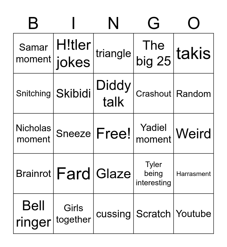 This bingo card has a free space and 24 words: Fard, Girls together, Diddy talk, Bell ringer, takis, Samar moment, Snitching, H!tler jokes, Yadiel moment, Glaze, Crashout, Nicholas moment, Tyler being interesting, Harrasment, Skibidi, Scratch, Weird, triangle, Random, Sneeze, Youtube, Brainrot, The big 25 and cussing.
