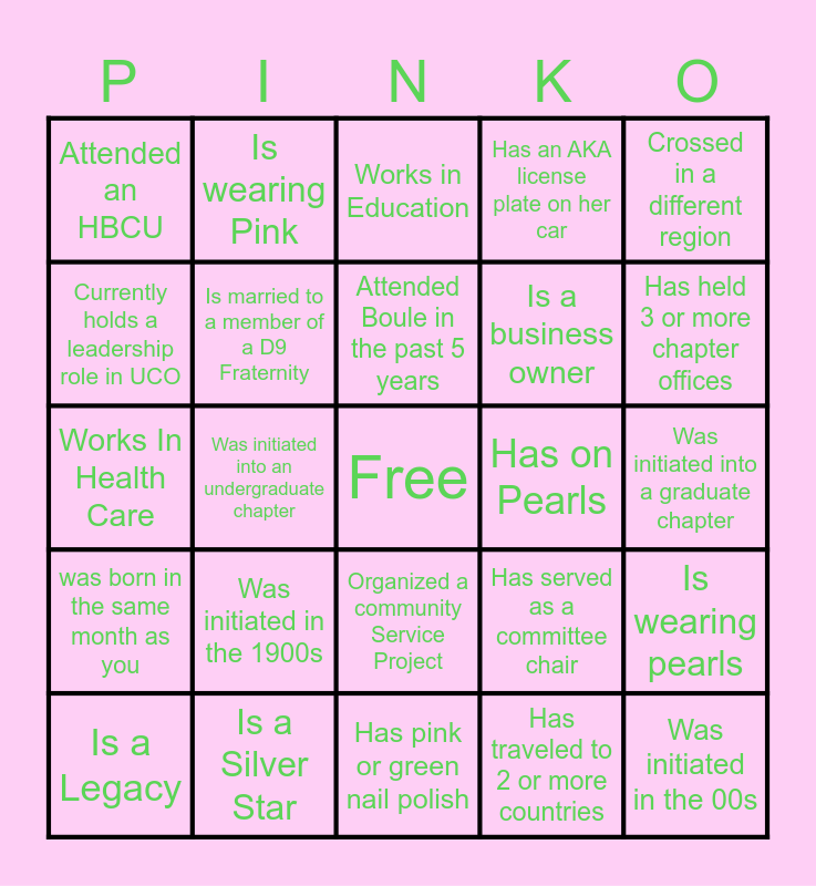 This bingo card has a free space and 24 words: Was initiated in the 1900s, Is a Silver Star, Attended Boule in the past 5 years, Is a Legacy, Crossed in a different region, Attended an HBCU, Currently holds a leadership role in UCO, Is wearing Pink, Has on Pearls, Organized a community Service Project, Is a business owner, Works In Health Care, Has served as a committee chair, Is wearing pearls, Is married to a member of a D9 Fraternity, Has traveled to 2 or more countries, Was initiated into a graduate chapter, Works in Education, Has held 3 or more chapter offices, Was initiated into an undergraduate chapter, Was initiated in the 00s, was born in the same month as you, Has an AKA license plate on her car and Has pink or green nail polish.