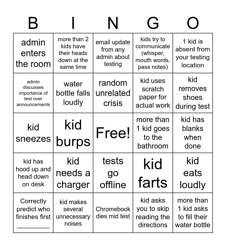 This bingo card has a free space and 38 words: same kid gets up 5 times for no real reason, kid has blanks when done, kid asks to use Chromebook because they're done, water bottle falls loudly, kid eats loudly, kid needs a charger, random unrelated crisis, opt out email update, 1 kid is absent from your testing location, kid uses scratch paper for actual work, kid burps, kids try to communicate (whisper, mouth words, pass notes), more than 1 kid asks to fill their water bottle, kid has blanks when done, admin discusses importance of test over announcements, kid has hood up and head down on desk, kid finishes in less than 10 minutes, email update from any admin about testing, kid is signed out due to inactivity, more than 1 kid goes to the bathroom, admin enters the room, kid makes several unnecessary noises, kid removes shoes during test, Correctly predict who finishes first _________, email from the D.O., Chromebook dies mid test, kid asks for extra scratch paper, your school phones rings, you get a kid to smile, admin reads an inspirational quote on announcements, bell goes off, tests go offline, kid asks you to skip reading the directions, more than 2 kids have their heads down at the same time, static on announcements, kid farts, kid sneezes and kid plays with their hair.
