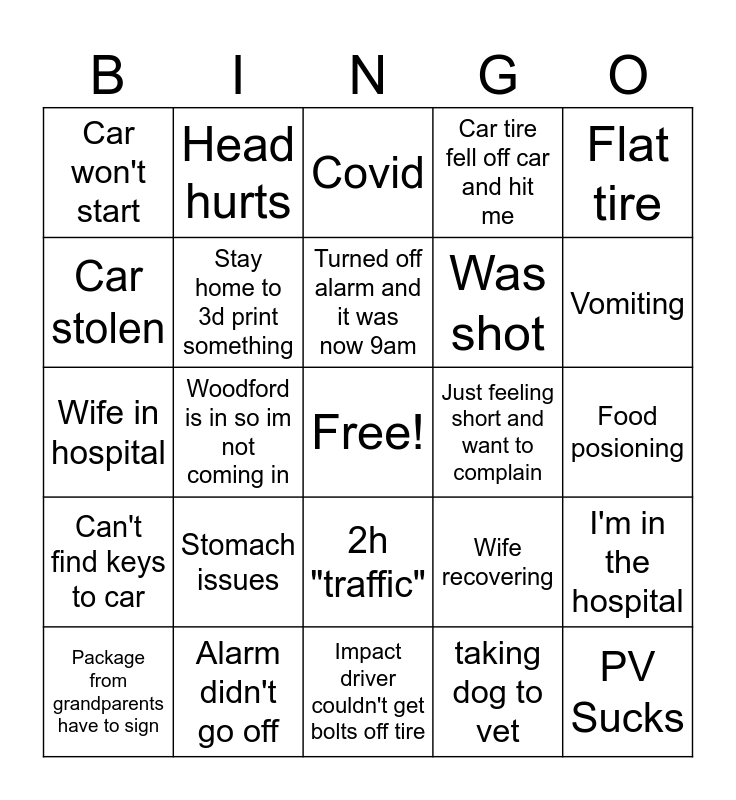 This bingo card has a free space and 24 words: Stomach issues, Alarm didn't go off, Turned off alarm and it was now 9am, Package from grandparents have to sign, Flat tire, Car won't start, Car stolen, Head hurts, Just feeling short and want to complain, 2h "traffic", Was shot, Wife in hospital, Wife recovering, I'm in the hospital, Stay home to 3d print something, taking dog to vet, Food posioning, Covid, Vomiting, Woodford is in so im not coming in, PV Sucks, Can't find keys to car, Car tire fell off car and hit me and Impact driver couldn't get bolts off tire.