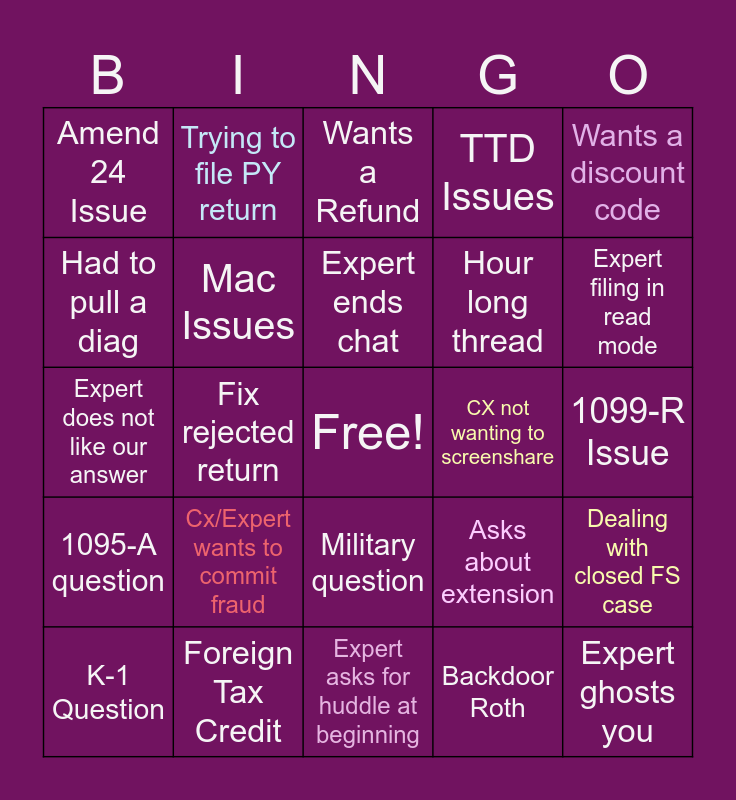 This bingo card has a free space and 24 words: Cx/Expert wants to commit fraud, Foreign Tax Credit, Expert ends chat, K-1 Question, Wants a discount code, Amend 24 Issue, Had to pull a diag, Trying to file PY return, CX not wanting to screenshare, Military question, Hour long thread, Expert does not like our answer, Asks about extension, Dealing with closed FS case, Mac Issues, Backdoor Roth, 1099-R Issue, Wants a Refund, Expert filing in read mode, Fix rejected return, Expert ghosts you, 1095-A question, TTD Issues and Expert asks for huddle at beginning.