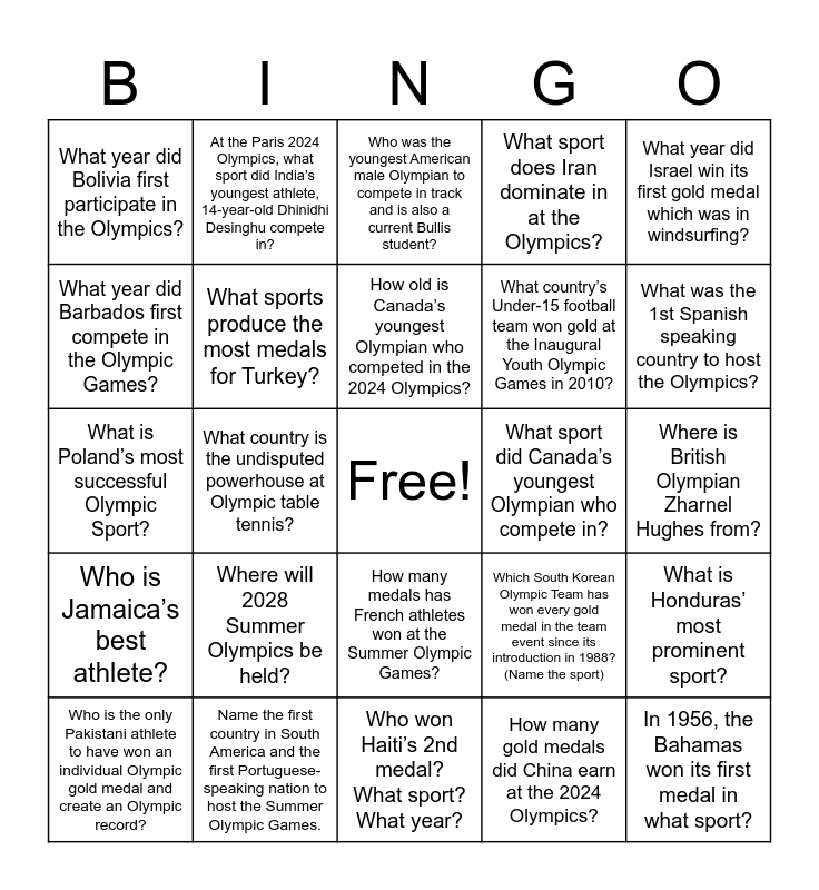 This bingo card has a free space and 52 words: When did Haiti earn its first medal?, In 1956, the Bahamas won its first medal in what sport?, What country has won more Olympic medals than any other country with a population under 1 million?, Who won Haiti’s 2nd medal? What sport? What year?, Where will 2028 Summer Olympics be held?, How many members were on India’s 2024 Olympics Shooting Team?, At the Paris 2024 Olympics, what sport did India’s youngest athlete, 14-year-old Dhinidhi Desinghu compete in?, What track and field event did Barbados Sprinter Obadele Thompson win a bronze medal during the 2000 Summer Olympics?, What year did Barbados first compete in the Olympic Games?, What year did Turkey 1st participate at the Olympics?, What sports produce the most medals for Turkey?, What year did Honduras first participate in the Olympics?, What is Honduras’ most prominent sport?, Which South Korean Olympic Team has won every gold medal in the team event since its introduction in 1988? (Name the sport), What Olympic sport does South Korea lead in medal count?, How many times has Canada hosted the Olympics?, How old is Canada’s youngest Olympian who competed in the 2024 Olympics?, What sport did Canada’s youngest Olympian who compete in?, Who is Israel’s top Olympian?, What year did Israel win its first gold medal which was in windsurfing?, What country is the undisputed powerhouse at Olympic table tennis?, How many gold medals did China earn at the 2024 Olympics?, What year did Bolivia first participate in the Olympics?, What country’s Under-15 football team won gold at the Inaugural Youth Olympic Games in 2010?, Colombia’s first gold medal was in what sport?, Name the third most successful South American country at the Olympics., What country is considered the most successful African country in Olympic history?, Who is the greatest marathoner of all time?, What was the 1st Spanish speaking country to host the Olympics?, Mexico is known for medal placing is what Olympic sport?, Who earned Iran’s first Olympic gold medal in 1948?, What sport does Iran dominate in at the Olympics?, How many Olympic medals has Ghana earned in boxing?, What country was the first African nation to win in Men’s soccer?, In 1948, who was the first Black woman from any country to win an Olympic medal and where was she from?, Who was the youngest American male Olympian to compete in track and is also a current Bullis student?, Name the first country in South America and the first Portuguese-speaking nation to host the Summer Olympic Games., Name the medal winning sports for Brazil., How many Olympic medals has Tanzania won?, Do you know what year Tanzania first participated in the Olympics?, Anguilla is a British Overseas Territory which means that when they compete in the Olympics, they compete under which country?, Where is British Olympian Zharnel Hughes from?, Who is Jamaica’s best athlete?, How many medals has Jamaica won since their first Olympic appearance in 1948?, How many medals has French athletes won at the Summer Olympic Games?, What 2 sports has France achieved the most success?, Name the Polish speed climber that won a gold medal in the 2024 Olympics., What is Poland’s most successful Olympic Sport?, When did Ukraine first participate in the Olympic Games as an independent nation?, What is Ukraine’s top medal-producing sport at the Summer Olympic Games?, Who is the only Pakistani athlete to have won an individual Olympic gold medal and create an Olympic record? and What Pakistani team won eight medals in the nine games it participated in between 1956 and 1992?.