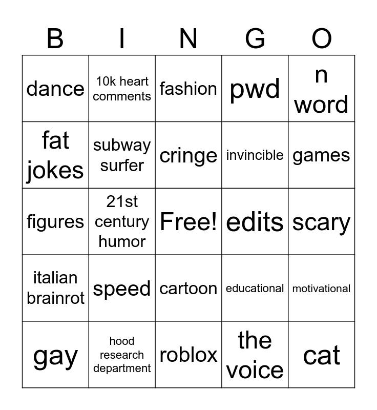This bingo card has a free space and 24 words: speed, hood research department, cringe, gay, n word, dance, fat jokes, 10k heart comments, edits, cartoon, invincible, figures, educational, motivational, subway surfer, the voice, scary, fashion, games, 21st century humor, cat, italian brainrot, pwd and roblox.