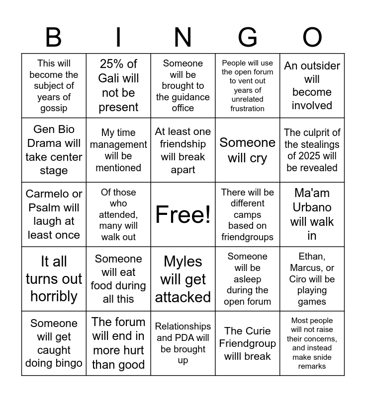 This bingo card has a free space and 24 words: Someone will eat food during all this, The forum will end in more hurt than good, At least one friendship will break apart, Someone will get caught doing bingo, An outsider will become involved, This will become the subject of years of gossip, Gen Bio Drama will take center stage, 25% of Gali will not be present, There will be different camps based on friendgroups, Myles will get attacked, Someone will cry, Carmelo or Psalm will laugh at least once, Someone will be asleep during the open forum, Ethan, Marcus, or Ciro will be playing games, My time management will be mentioned, The Curie Friendgroup willl break, Ma'am Urbano will walk in, Someone will be brought to the guidance office, The culprit of the stealings of 2025 will be revealed, Of those who attended, many will walk out, Most people will not raise their concerns, and instead make snide remarks, It all turns out horribly, People will use the open forum to vent out years of unrelated frustration and Relationships and PDA will be brought up.