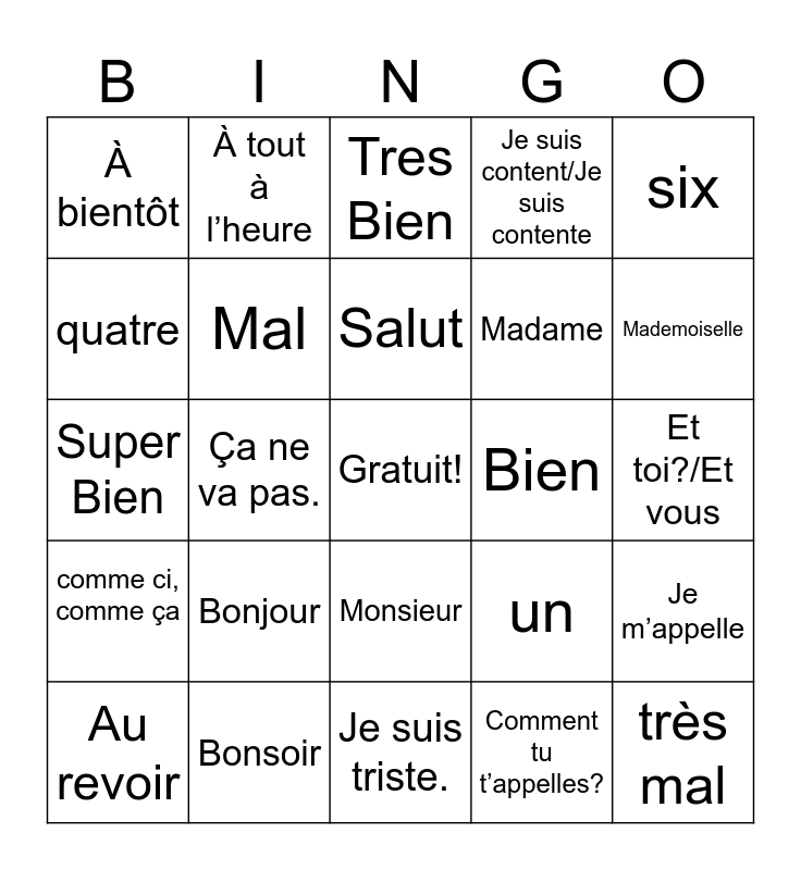 This bingo card has a free space and 24 words: Bonjour, Bonsoir, Salut, Au revoir, six, À bientôt, quatre, À tout à l’heure, Bien, Monsieur, Madame, Super Bien, un, Je m’appelle, Mal, Comment tu t’appelles?, Et toi?/Et vous, Tres Bien, Mademoiselle, Ça ne va pas., très mal, comme ci, comme ça, Je suis content/Je suis contente and Je suis triste..