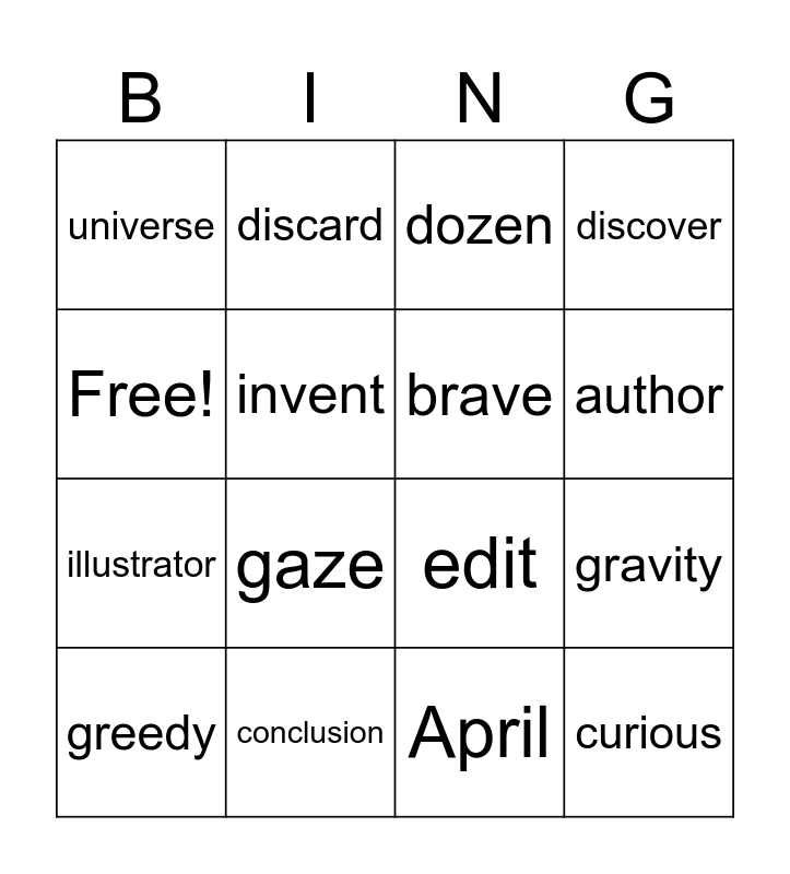 This bingo card has 16 words: conclusion, gravity, dozen, universe, illustrator, discard, edit, April, Free!, invent, greedy, discover, gaze, author, brave and curious.