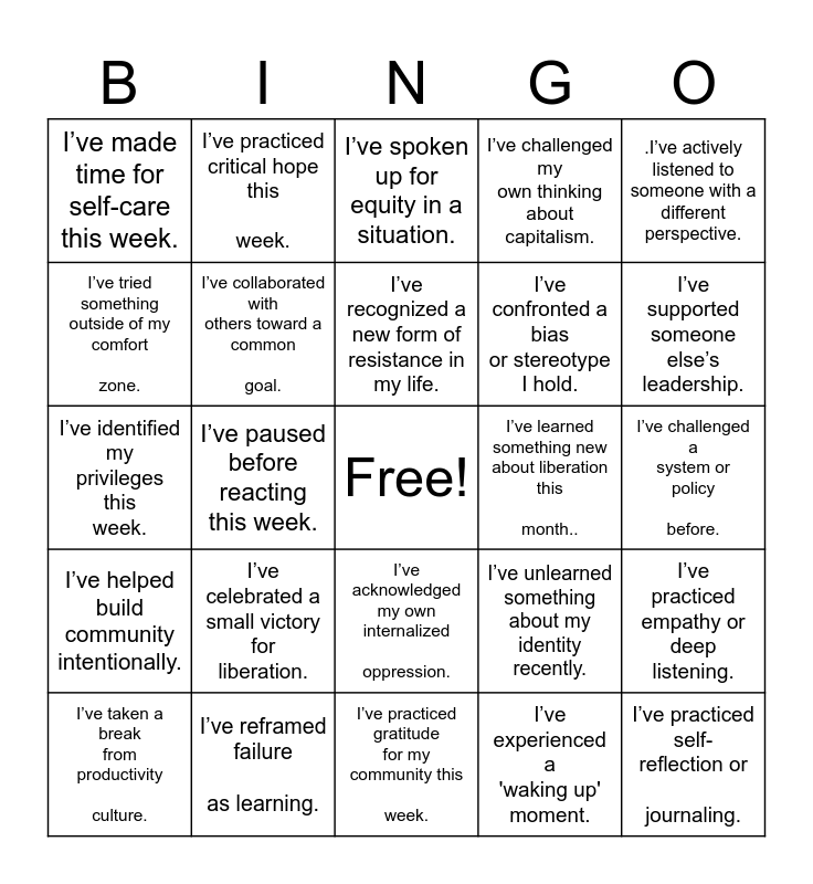 This bingo card has a free space and 24 words: I’ve celebrated a small victory for liberation., I’ve reframed failure as learning., I’ve recognized a new form of resistance in my life., I’ve taken a break from productivity culture., .I’ve actively listened to someone with a different perspective., I’ve made time for self-care this week., I’ve tried something outside of my comfort zone., I’ve practiced critical hope this week., I’ve learned something new about liberation this month.., I’ve acknowledged my own internalized oppression., I’ve confronted a bias or stereotype I hold., I’ve identified my privileges this week., I’ve unlearned something about my identity recently., I’ve practiced empathy or deep listening., I’ve collaborated with others toward a common goal., I’ve experienced a 'waking up' moment., I’ve challenged a system or policy before., I’ve spoken up for equity in a situation., I’ve supported someone else’s leadership., I’ve paused before reacting this week., I’ve practiced self- reflection or journaling., I’ve helped build community intentionally., I’ve challenged my own thinking about capitalism. and I’ve practiced gratitude for my community this week..
