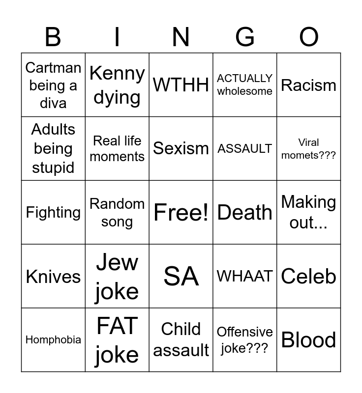 This bingo card has a free space and 24 words: Jew joke, FAT joke, Sexism, Homphobia, Racism, Cartman being a diva, Adults being stupid, Kenny dying, Death, SA, ASSAULT, Fighting, WHAAT, Celeb, Real life moments, Offensive joke???, Making out..., WTHH, Viral momets???, Random song, Blood, Knives, ACTUALLY wholesome and Child assault.