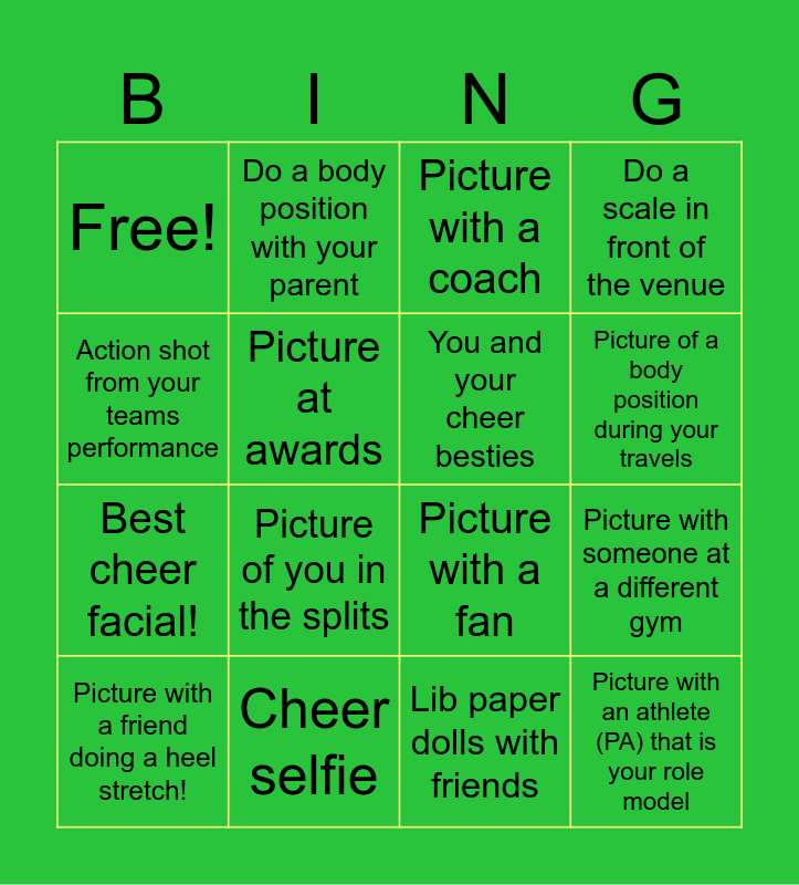 This bingo card has 16 words: Picture with a friend doing a heel stretch!, Cheer selfie, Picture with a coach, Do a scale in front of the venue, Action shot from your teams performance, Do a body position with your parent, Picture with a fan, Picture with someone at a different gym, Free!, Picture at awards, Lib paper dolls with friends, Picture of a body position during your travels, Best cheer facial!, Picture of you in the splits, You and your cheer besties and Picture with an athlete (PA) that is your role model.