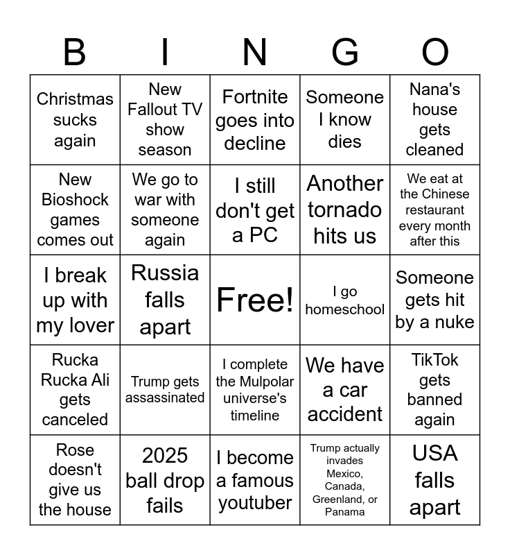 This bingo card has a free space and 24 words: Trump gets assassinated, 2025 ball drop fails, I still don't get a PC, Rose doesn't give us the house, Nana's house gets cleaned, Christmas sucks again, New Bioshock games comes out, New Fallout TV show season, I go homeschool, I complete the Mulpolar universe's timeline, Another tornado hits us, I break up with my lover, We have a car accident, TikTok gets banned again, We go to war with someone again, Trump actually invades Mexico, Canada, Greenland, or Panama, Someone gets hit by a nuke, Fortnite goes into decline, We eat at the Chinese restaurant every month after this, Russia falls apart, USA falls apart, Rucka Rucka Ali gets canceled, Someone I know dies and I become a famous youtuber.