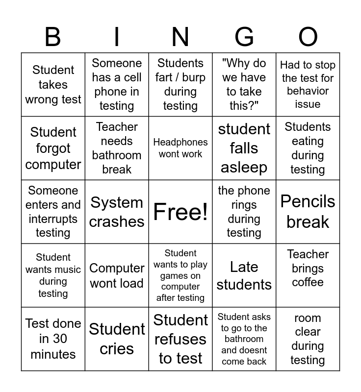 This bingo card has a free space and 24 words: Computer wont load, Student cries, Headphones wont work, Test done in 30 minutes, Had to stop the test for behavior issue, Student takes wrong test, Student forgot computer, Someone has a cell phone in testing, the phone rings during testing, Student wants to play games on computer after testing, student falls asleep, Someone enters and interrupts testing, Late students, Teacher brings coffee, Teacher needs bathroom break, Student asks to go to the bathroom and doesnt come back, Pencils break, Students fart / burp during testing, Students eating during testing, System crashes, room clear during testing, Student wants music during testing, "Why do we have to take this?" and Student refuses to test.