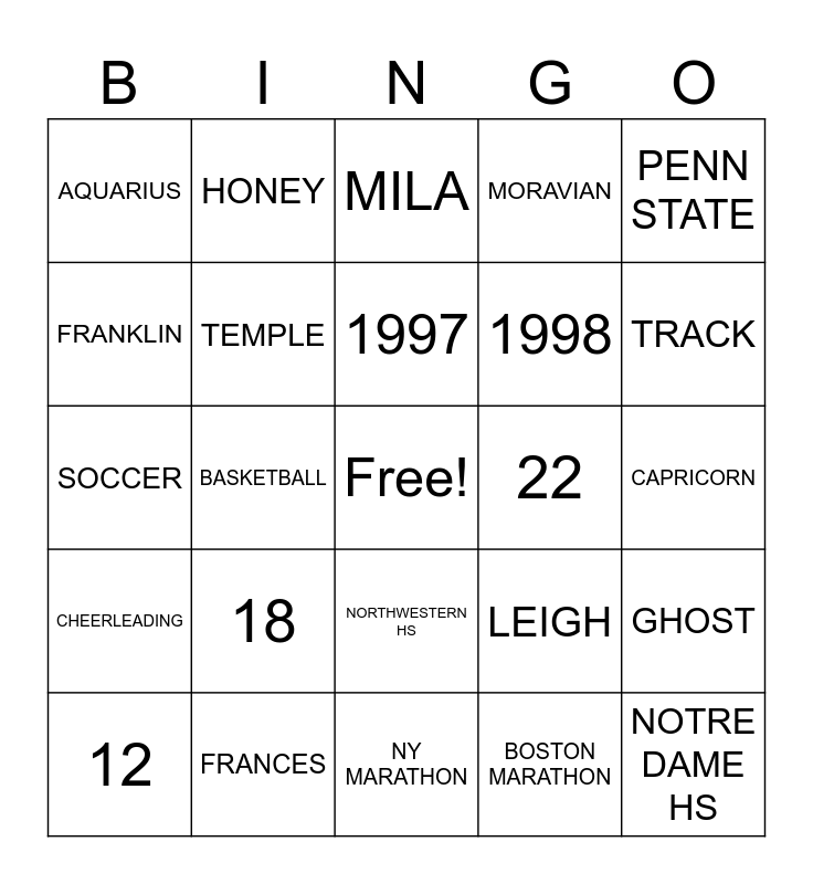 This bingo card has a free space and 24 words: 18, FRANCES, 1997, 12, PENN STATE, AQUARIUS, FRANKLIN, HONEY, 22, NORTHWESTERN HS, 1998, SOCCER, LEIGH, GHOST, TEMPLE, BOSTON MARATHON, CAPRICORN, MILA, TRACK, BASKETBALL, NOTRE DAME HS, CHEERLEADING, MORAVIAN and NY MARATHON.