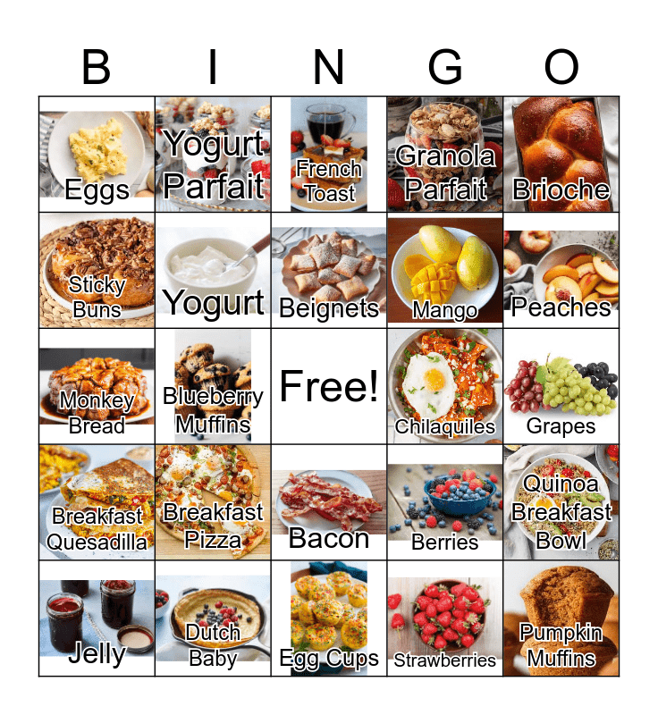 This bingo card has 75 images, a free space and 75 words: Pancakes, Waffles, French Toast, Cinnamon Rolls, Bagels, Pastries, Croissants, Scones, Toast, Pop-Tarts, Crepes, Frittata, Beignets, Sticky Buns, Banana Bread, Blueberry Muffins, Chocolate Chip Muffins, Pumpkin Muffins, Cornbread, Brioche, Coffee Cake, Monkey Bread, Yogurt, Yogurt Parfait, Granola Parfait, Chia Seed Pudding, Overnight Oats, Oatmeal, Porridge, Cream of Wheat, Rice Pudding, Muesli, Fruit Salad, Berries, Peaches, Mango, Pineapple, Bannas, Grapes, Strawberries, Blueberries, Raspberries, Blackberries, Honey, Maple Syrup, Jam, Jelly, Eggs, Breakfast Burrito, Breakfast Sandwich, Breakfast Tacos, Bacon, Sausage, Ham, Breakfast Casserole, Quiche, Hash Browns, Grits, Shrimp and Grits, Biscuits and Gravy, Breakfast Pizza, Steak and Eggs, Eggs Benedict, Huevos Rancheros, Migas, Chilaquiles, Avocado Toast, Tofu Scramble, Lentil Breakfast Bowl, Quinoa Breakfast Bowl, Breakfast Quesadilla, Dutch Baby, Omelette, Egg Cups and Protein Shake.