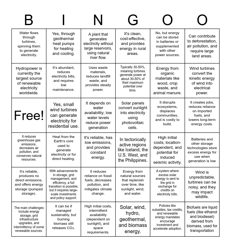 This bingo card has 36 words: Energy from natural sources that replenish over time, like sunlight, wind, and water., It reduces reliance on fossil fuels, decreases pollution, and mitigates climate change., Solar, wind, hydro, geothermal, and biomass energy., Hydropower is currently the largest source of renewable electricity worldwide., It reduces greenhouse gas emissions, decreases air pollution, and conserves natural resources., Solar panels convert sunlight into electricity using photovoltaic cells., It’s abundant, reduces electricity bills, and requires low maintenance., High initial costs, intermittent availability (dependent on sunlight), and space requirements., No, but energy can be stored in batteries or supplemented with other power sources., A system where excess solar energy is sent to the grid in exchange for credits on electricity bills., Wind turbines convert the kinetic energy of wind into electrical power., It’s clean, cost-effective, and provides energy in rural areas., Wind is unpredictable, turbines can be noisy, and they may impact wildlife., Yes, small wind turbines can generate electricity for residential use., Typically 30-50%, meaning turbines generate power at about 30-50% of their maximum potential over time., Water flows through turbines, spinning them to generate electricity., It’s reliable, produces no direct emissions, and offers energy storage (pumped storage)., It disrupts ecosystems, displaces communities, and is costly to build., Free!, A plant that generates electricity without large reservoirs, using natural river flow., It depends on water availability; low water levels reduce power generation, Heat from the Earth’s core used to generate electricity or for direct heating., In tectonically active regions like Iceland, the U.S. West, and the Philippines., It’s reliable, has low emissions, and provides constant energy., High initial costs, location-dependent, and potential for induced seismic activity., Yes, through geothermal heat pumps for heating and cooling., Energy from organic materials like wood, crop waste, and animal manure., It can be if managed sustainably, but burning biomass still releases CO₂., Uses waste materials, reduces landfill waste, and provides steady power., Can contribute to deforestation, air pollution, and require large land areas., Biofuels are liquid fuels (like ethanol and biodiesel) derived from biomass, used for transportation, The main challenges include energy storage, grid infrastructure upgrades, and intermittency of some renewable sources., Batteries and other storage technologies store excess energy for use when generation is low, It creates jobs, reduces reliance on imported fuels, and lowers long-term energy costs., With advancements in storage, grid management, and efficiency, a full transition is possible, but it requires large-scale investments and policy support. and Policies like subsidies, tax credits, and renewable energy mandates encourage investment and accelerate adoption..