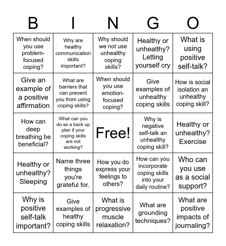 This bingo card has a free space and 27 words: How can you incorporate coping skills into your daily routine?, Why is avoiding problems an unhealthy coping skill?, Give examples of unhealthy coping skills, What is progressive muscle relaxation?, Give an example of a positive affirmation, Why should we not use unhealthy coping skills?, Why are healthy communication skills important?, Healthy or unhealthy? Sleeping, Why is negative self-talk an unhealthy coping skill?, Who can you use as a social support?, How can deep breathing be beneficial?, Healthy or unhealthy? Letting yourself cry, Why is positive self-talk important?, Give examples of healthy coping skills, How is social isolation an unhealthy coping skill?, Explain mindfulness, What are barriers that can prevent you from using coping skills?, When should you use emotion-focused coping?, Name three things you're grateful for., When should you use problem-focused coping?, Healthy or unhealthy? Exercise, What are grounding techniques?, What can you do as a back up plan if your coping skills are not working?, What are positive impacts of journaling?, How you do express your feelings to others?, What is using positive self-talk? and What is your favorite coping skill?.