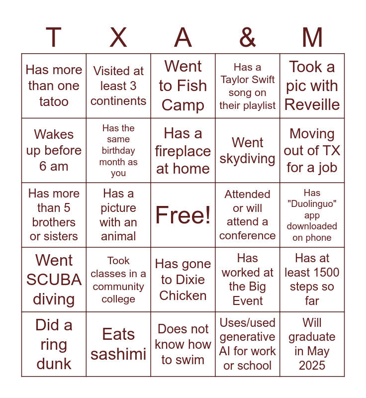This bingo card has a free space and 24 words: Took classes in a community college, Eats sashimi, Has a fireplace at home, Did a ring dunk, Took a pic with Reveille, Has more than one tatoo, Wakes up before 6 am, Visited at least 3 continents, Attended or will attend a conference, Has gone to Dixie Chicken, Went skydiving, Has more than 5 brothers or sisters, Has worked at the Big Event, Has at least 1500 steps so far, Has the same birthday month as you, Uses/used generative AI for work or school, Has "Duolinguo" app downloaded on phone, Went to Fish Camp, Moving out of TX for a job, Has a picture with an animal, Will graduate in May 2025, Went SCUBA diving, Has a Taylor Swift song on their playlist and Does not know how to swim.