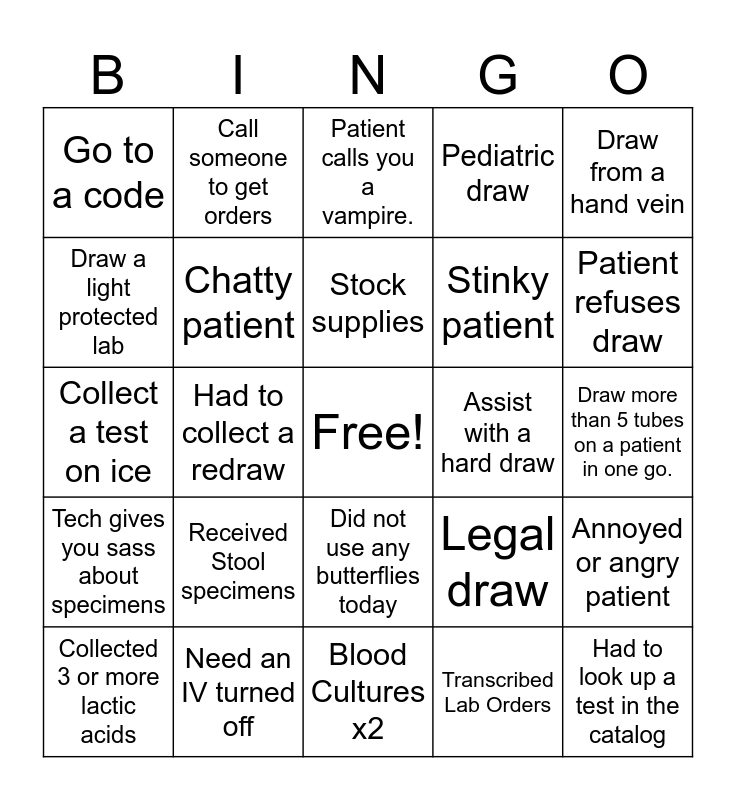 This bingo card has a free space and 24 words: Collected 3 or more lactic acids, Received Stool specimens, Stock supplies, Transcribed Lab Orders, Draw from a hand vein, Go to a code, Call someone to get orders, Patient calls you a vampire., Assist with a hard draw, Draw more than 5 tubes on a patient in one go., Collect a test on ice, Chatty patient, Legal draw, Annoyed or angry patient, Draw a light protected lab, Need an IV turned off, Blood Cultures x2, Pediatric draw, Patient refuses draw, Tech gives you sass about specimens, Had to collect a redraw, Did not use any butterflies today, Stinky patient and Had to look up a test in the catalog.