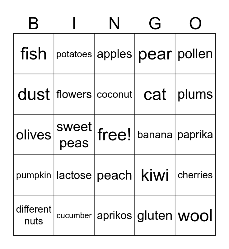 This bingo card has a free space and 24 words: lactose, cucumber, coconut, different nuts, pollen, fish, dust, potatoes, banana, peach, cat, olives, kiwi, cherries, flowers, gluten, paprika, apples, plums, sweet peas, wool, pumpkin, pear and aprikos.