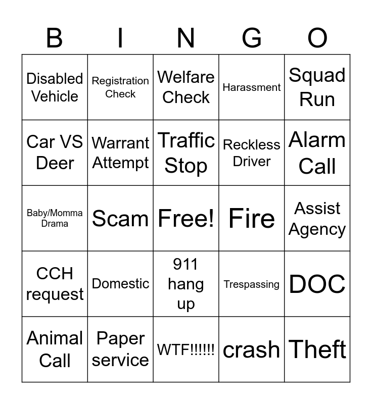 This bingo card has a free space and 25 words: Domestic, WTF!!!!!!, Traffic Stop, Animal Call, Squad Run, Disabled Vehicle, Car VS Deer, Registration Check, Fire, 911 hang up, Reckless Driver, Baby/Momma Drama, Trespassing, DOC, Warrant Attempt, Transfer to Another agency, Assist Agency, Welfare Check, Alarm Call, Scam, Theft, Paper service, CCH request, Harassment and crash.