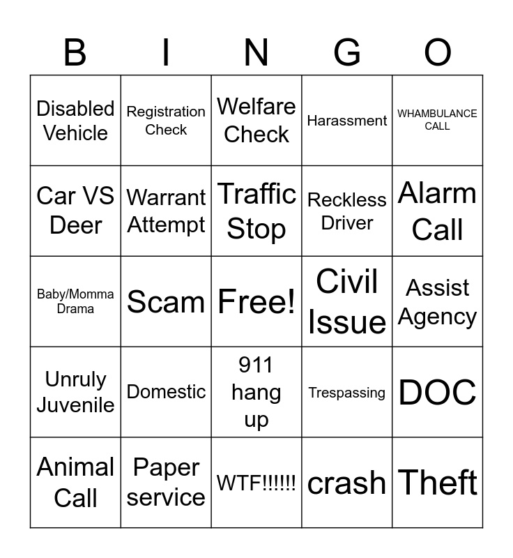 This bingo card has a free space and 25 words: Domestic, WTF!!!!!!, Traffic Stop, Animal Call, WHAMBULANCE CALL, Disabled Vehicle, Car VS Deer, Registration Check, Civil Issue, 911 hang up, Reckless Driver, Baby/Momma Drama, Trespassing, DOC, Warrant Attempt, Transfer to Another agency, Assist Agency, Welfare Check, Alarm Call, Scam, Theft, Paper service, Unruly Juvenile, Harassment and crash.