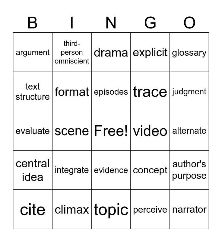 This bingo card has a free space and 119 words: third-person objective, affect, characters, textual evidence, support, analyze, explicit, implicit, quote, accurate, examples, convey, characterization, literary devices, distinct, annotate, evidence, describe, drama, poetry, cite, drama, analyze, anecdote, attitude, central idea, climax, conflict, exposition, inference, judgment, episodes, scene, determine, literal, nonliteral, simile, metaphor, hyperbole, personification, repetition, imagery, compare, contrast, narrative, audio, video, perceive, approach, topic, generalization, concept, main idea, key individual, motivations, opinion, plot, resolution, key event, key idea, introduced, illustrated, elaborated, contribute, media, format, visually quantitatively, coherent, trace, evaluate, debatable, alternate, organize, logically, creditable, tone, mood, narrator, integrate, argument, biography, autobiography, genre, explain, develop, first-person, second-person, third-person limited, third-person omniscient, quote, paraphrase, plagiarism, affix, prefix, suffix, root, glossary, thesaurus, synonym, antonym, interpret, connotative, summary, supporting details, theme, objective, fact, figurative language, denotative meaning, connotative meaning, context clues, text structure, problem and solution, chronological, compare and contrast, cause and effect, sequential order, author's purpose and author's point of view.