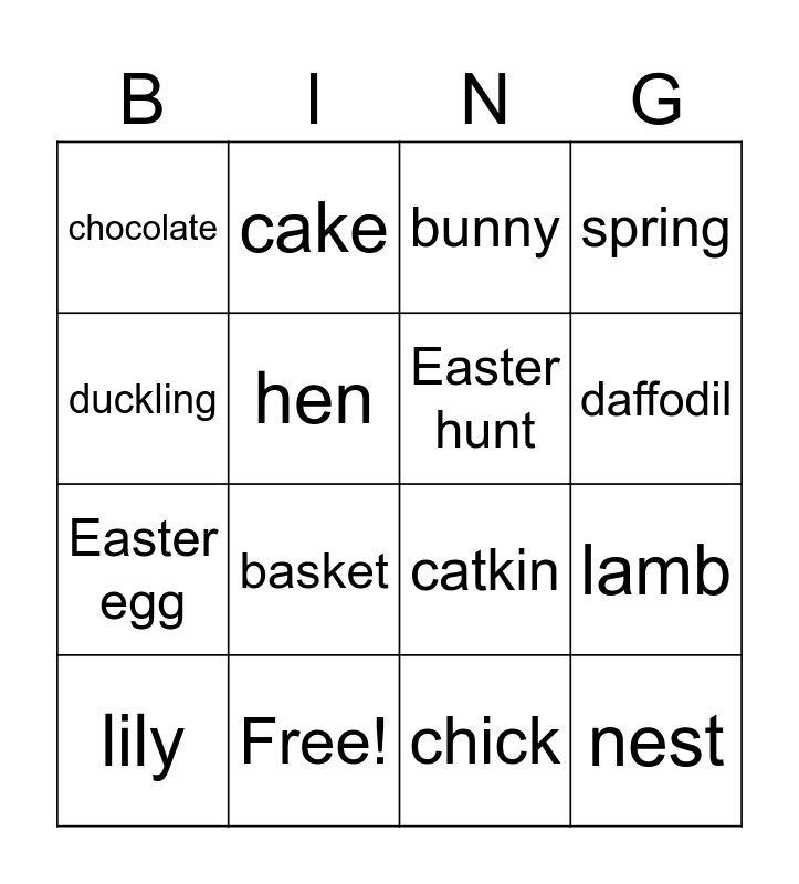 This bingo card has 16 words: Free!, lamb, bunny, chocolate, Easter egg, cake, catkin, chick, duckling, hen, lily, spring, basket, daffodil, Easter hunt and nest.