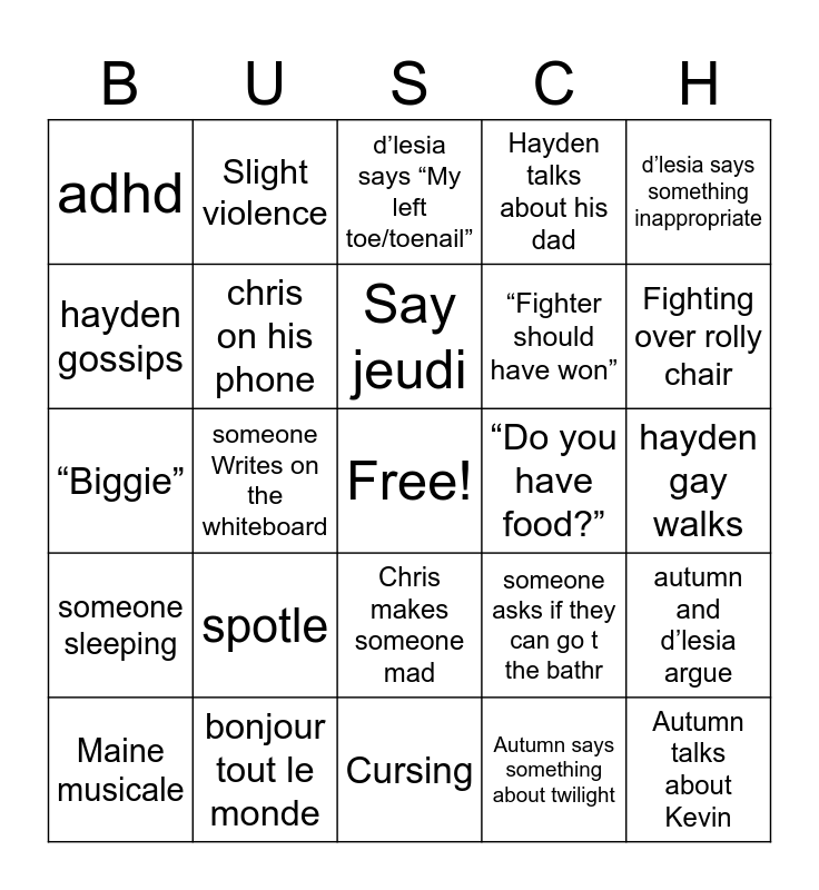 This bingo card has a free space and 24 words: spotle, bonjour tout le monde, Say jeudi, Maine musicale, d’lesia says something inappropriate, adhd, hayden gossips, Slight violence, “Do you have food?”, Chris makes someone mad, “Fighter should have won”, “Biggie”, someone asks if they can go t the bathr, autumn and d’lesia argue, chris on his phone, Autumn says something about twilight, hayden gay walks, d’lesia says “My left toe/toenail”, Fighting over rolly chair, someone Writes on the whiteboard, Autumn talks about Kevin, someone sleeping, Hayden talks about his dad and Cursing.