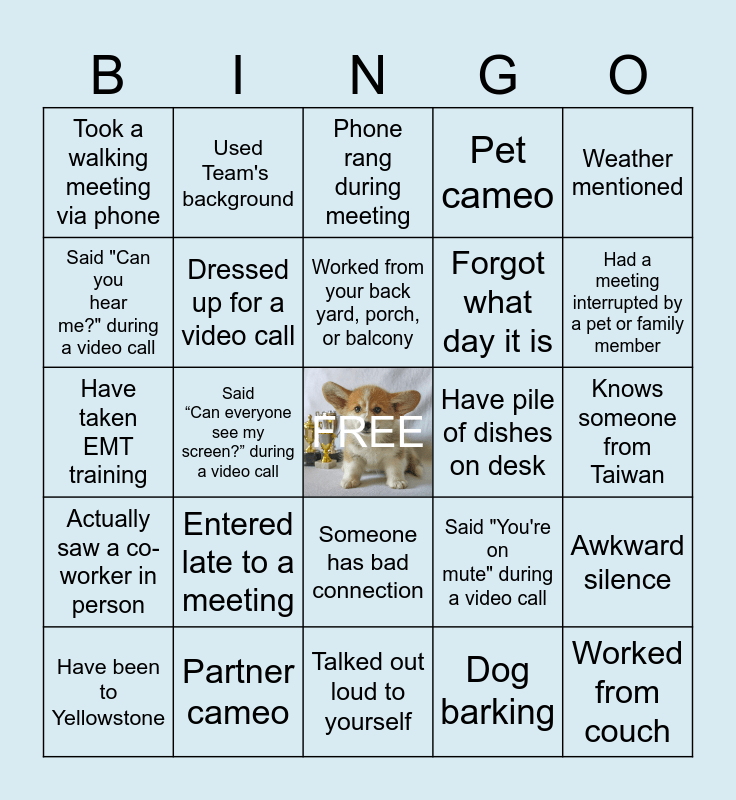 This bingo card has a free space and 24 words: Entered late to a meeting, Partner cameo, Worked from your back yard, porch, or balcony, Have been to Yellowstone, Weather mentioned, Took a walking meeting via phone, Said "Can you hear me?" during a video call, Used Team's background, Have pile of dishes on desk, Someone has bad connection, Forgot what day it is, Have taken EMT training, Said "You're on mute" during a video call, Awkward silence, Dressed up for a video call, Dog barking, Knows someone from Taiwan, Phone rang during meeting, Had a meeting interrupted by a pet or family member, Said “Can everyone see my screen?” during a video call, Worked from couch, Actually saw a co-worker in person, Pet cameo and Talked out loud to yourself.
