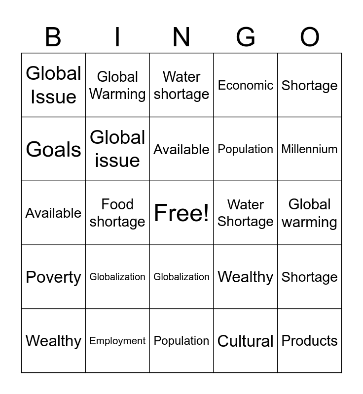 This bingo card has a free space and 25 words: Globalization, Population, Available, Wealthy, Shortage, Global Issue, Goals, Global Warming, Water Shortage, Globalization, Population, Available, Wealthy, Shortage, Global issue, Goals, Global warming, Water shortage, Millennium, Food shortage, Products, Employment, Poverty, Economic and Cultural.
