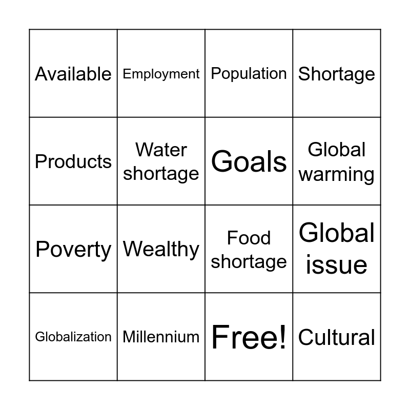 This bingo card has 17 words: Free!, Globalization, Population, Available, Wealthy, Shortage, Global issue, Goals, Global warming, Water shortage, Millennium, Food shortage, Products, Employment, Poverty, Economic and Cultural.