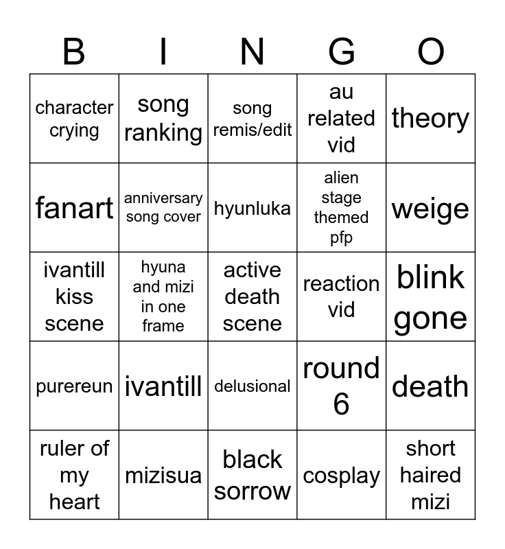This bingo card has a free space and 24 words: ivantill, mizisua, hyunluka, ruler of my heart, theory, character crying, fanart, song ranking, reaction vid, delusional, alien stage themed pfp, ivantill kiss scene, round 6, death, anniversary song cover, cosplay, blink gone, song remis/edit, weige, hyuna and mizi in one frame, short haired mizi, purereun, au related vid and black sorrow.