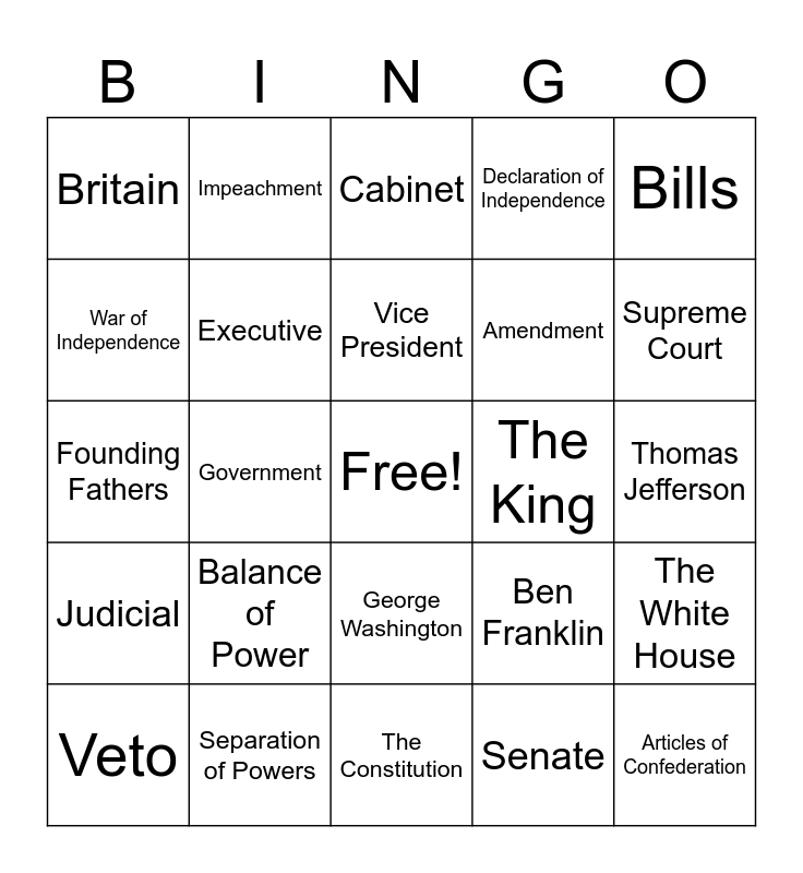 This bingo card has a free space and 34 words: Congress, Senate, House of Representatives, Legislative, Judicial, Executive, Bills, Veto, Impeachment, President, Vice President, Cabinet, Monarchy, Democracy, The King, Supreme Court, Separation of Powers, Founding Fathers, Balance of Power, Ben Franklin, George Washington, America, Britain, Thomas Jefferson, The Constitution, Articles of Confederation, Declaration of Independence, Bill of Rights, Amendment, War of Independence, Sovereignty, Government, The White House and The U.S. Capitol.