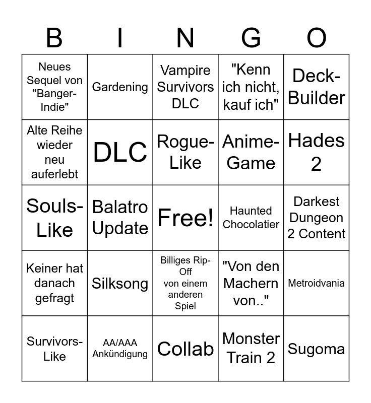 This bingo card has a free space and 24 words: Silksong, AA/AAA Ankündigung, Rogue-Like, Survivors-Like, Deck-Builder, Neues Sequel von "Banger-Indie", Alte Reihe wieder neu auferlebt, Gardening, Haunted Chocolatier, Billiges Rip-Off von einem anderen Spiel, Anime-Game, Souls-Like, "Von den Machern von..", Metroidvania, DLC, Monster Train 2, Darkest Dungeon 2 Content, Vampire Survivors DLC, Hades 2, Balatro Update, Sugoma, Keiner hat danach gefragt, "Kenn ich nicht, kauf ich" and Collab.