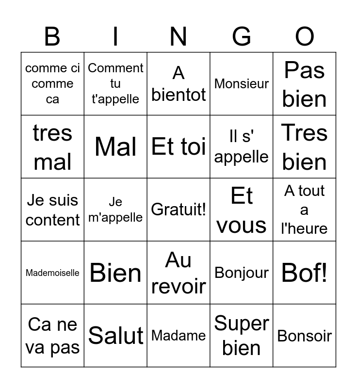 This bingo card has a free space and 24 words: Bien, Salut, Et toi, Ca ne va pas, Pas bien, comme ci comme ca, tres mal, Comment tu t'appelle, Et vous, Au revoir, Il s' appelle, Je suis content, Bonjour, Bof!, Mal, Super bien, A tout a l'heure, A bientot, Tres bien, Je m'appelle, Bonsoir, Mademoiselle, Monsieur and Madame.