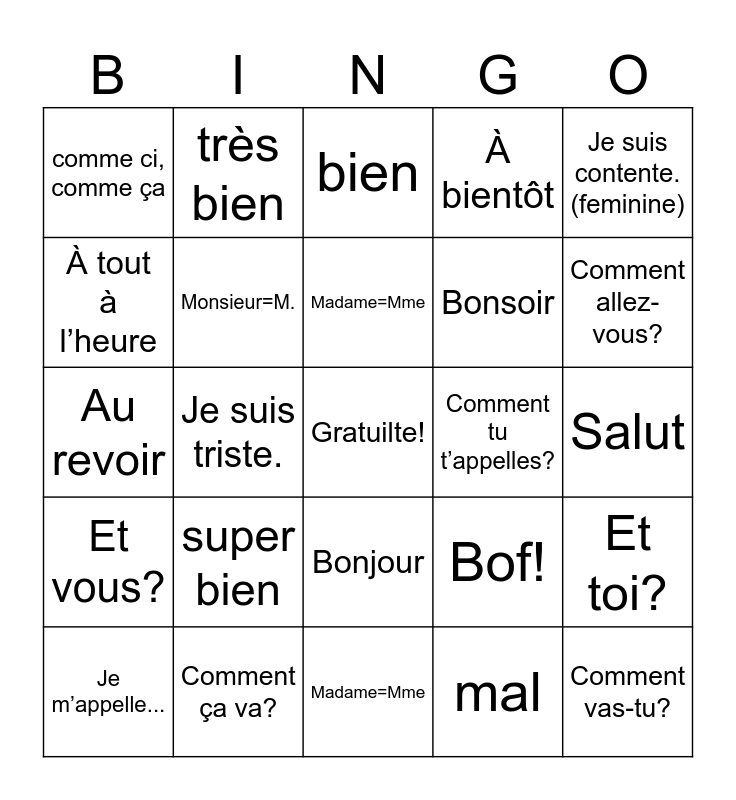 This bingo card has a free space and 24 words: super bien, Comment ça va?, Madame=Mme, Je m’appelle..., Je suis contente. (feminine), comme ci, comme ça, À tout à l’heure, très bien, Comment tu t’appelles?, Bonjour, Bonsoir, Au revoir, Bof!, Et toi?, Monsieur=M., mal, Salut, bien, Comment allez-vous?, Je suis triste., Comment vas-tu?, Et vous?, À bientôt and Madame=Mme.