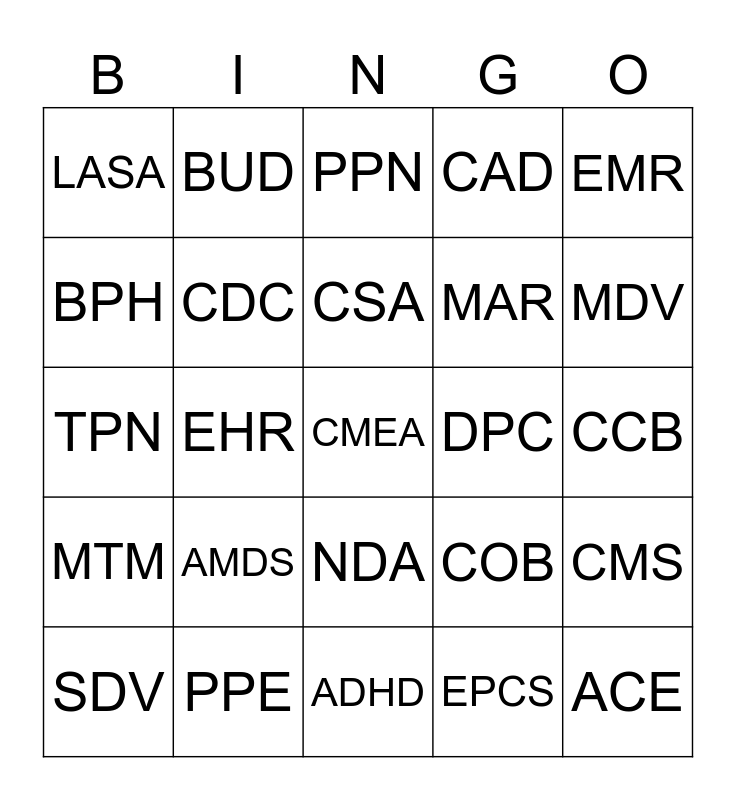This bingo card has a free space and 49 words: ACA, ACE, ADME, ADHD, AMDS, BSC, BUD, BTC, BPH, UNG, CDC, CAD, CMS, COB, CSP, CPOE, CSA, DPC, DVT, EMR, EHR, EPCS, LASA, MAR, MDI, MDV, SDV, NPI, NDA, MTM, ODA, NS, PCP, PIC, PPE, PPI, ACE, ARB, CCB, PPO, PBM, RTS, ROA, TJC, TPN, PPN, USP, USP-NF and SWFI.