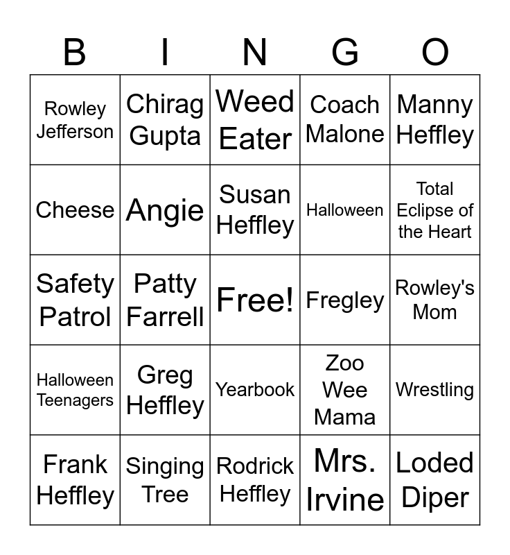 This bingo card has a free space and 25 words: Greg Heffley, Rodrick Heffley, Susan Heffley, Frank Heffley, Manny Heffley, Rowley Jefferson, Cheese, Chirag Gupta, Fregley, Yearbook, Halloween, Safety Patrol, Zoo Wee Mama, Wrestling, Angie, Collin, Rowley's Mom, Weed Eater, Total Eclipse of the Heart, Patty Farrell, Loded Diper, Singing Tree, Halloween Teenagers, Coach Malone and Mrs. Irvine.