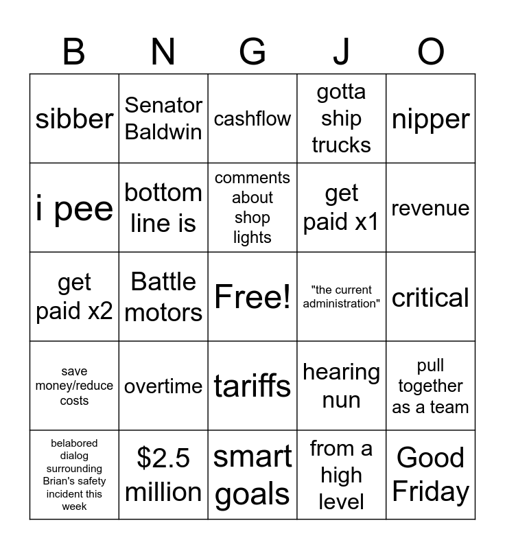 This bingo card has a free space and 24 words: overtime, $2.5 million, comments about shop lights, belabored dialog surrounding Brian's safety incident this week, nipper, sibber, i pee, Senator Baldwin, "the current administration", tariffs, get paid x1, get paid x2, hearing nun, pull together as a team, bottom line is, from a high level, critical, cashflow, revenue, Battle motors, Good Friday, save money/reduce costs, gotta ship trucks and smart goals.